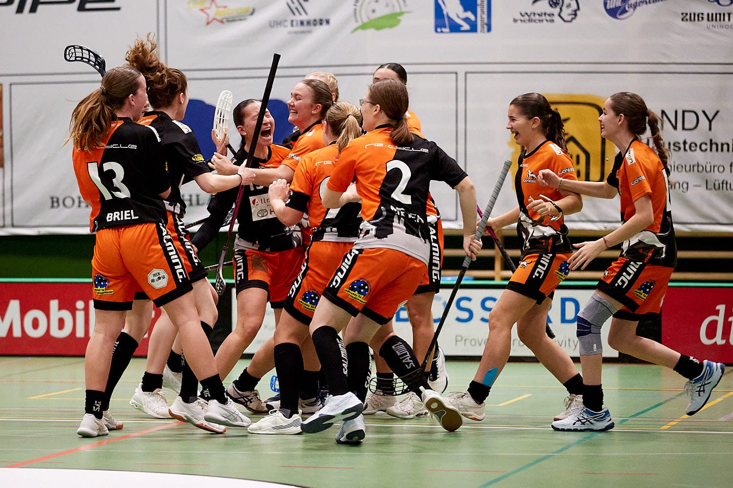 Für das letzte Drittel war klar, dass mindestens ein Tor her muss. Die ersten Punkte lagen definitiv in der Luft, dementsprechend war die Motivation im Team hoch. In der ersten Spielminute konnte man nochmals mit einer Spielerinn mehr auf dem Feld stehen, jedoch gelang auch hier kein Treffer. Zug United stand nach dem Powerplay wie zuvor wieder hoch, was unser Team erneut vor eine schwere Aufgabe stellte. Man hatte nun vermehrt Mühe, den Ball vorwärts zu Spielen und gefährliche Abschlüsse zu generieren. Um dem entgegenzuwirken, nahm der Trainerstaff der Lioness knapp 10 Minuten vor Schluss ihr Timeout, um dem Team letzte Anweisungen zu geben, wie die ersten Punkte nach Hause geholt werden können. In der 52. Minute musste erneut eine Zugerin auf die Strafbank, was unserem Powerplay bereits das vierte Mal die Chance bot, mit einer Spielerin mehr ein Tor zu erzielen. Doch auch wie zuvor gelang es Zug United souverän, die Spielzüge der Lioness zu durchschauen und zu stören. Kurz darauf kam die Anweisung an das Zürcher Team, die Zuger an ihrem Aufbau mehr zu stören, da diese bereits versuchten, die Zeit clever herunterzuspielen. Der Plan war klar: Ballgewinn, Torhüter raus und im besten Fall den Ausgleichstreffer. Doch soweit kam es gar nicht. Die Zugerinnen waren im Ballbesitz hinter dem Zürcher Tor und wollten den Ball zurück in die eigene Hälfte spielen, um die letzten 30 Sekunden des Spiels herunterzuspielen. Ein holpriger Ball zurück in die Zuger Verteidigung war der Startknopf für Ann Zurbuchen und Alisha Merz, die Spielerin mächtig unter Druck zu setzen. Tatsächlich verliert diese den Ball, welcher direkt auf die Schaufel von Ann Zurbuchen fiel. Diese hatte nun viel freien Platz vor sich, welchen sie geschickt ausnutze. 23 Sekunden vor Schluss ertönten Jubelschreie auf der Zürcher Bank. Unsere Nummer 15 versenkte den Ball gekonnt im nahen Eck auf Pass von Alisha Merz und sicherte unserer U21 somit den ersten Punkt der Saison! Denn das Team liess sich dieses Unentschieden in den letzten Sekunden der regulären Spielzeit nicht mehr nehmen. Man freute sich über das Unentschieden, als hätte man das Spiel gewonnen!